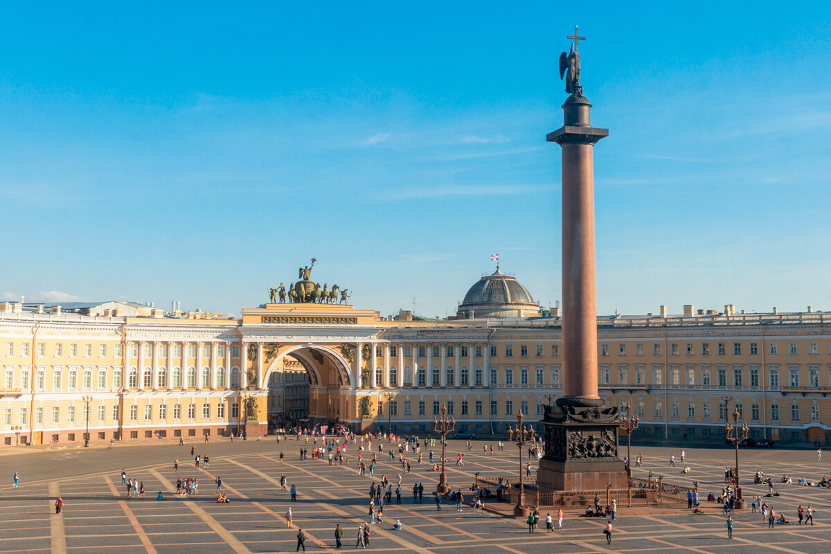 冬宫广场,俄罗斯的“紫禁城”,但只有天安门的九分之一。广场中间是亚历山大柱,柱子上面站立的是加冕着的天使。1924年,当地有考虑过用列宁的雕像替换天使的雕塑,但最后却不敢那样做。现在,城市群众活动也可以在宫殿广场上举行了。