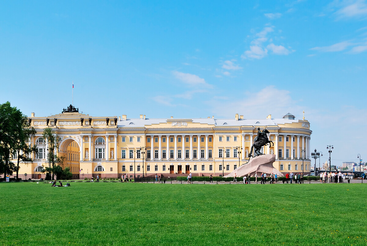 广场的名字叫参政院广场,因为以前这栋大楼是俄罗斯帝国最高国家权力机关,但现在参议楼已经成为俄罗斯联邦宪法法院了。参议楼前还有一个青铜骑士,是1982年纪念彼得一世的纪念碑。1925年,这里被更名为十二月党人广场,用以纪念1825年的十二月革命。